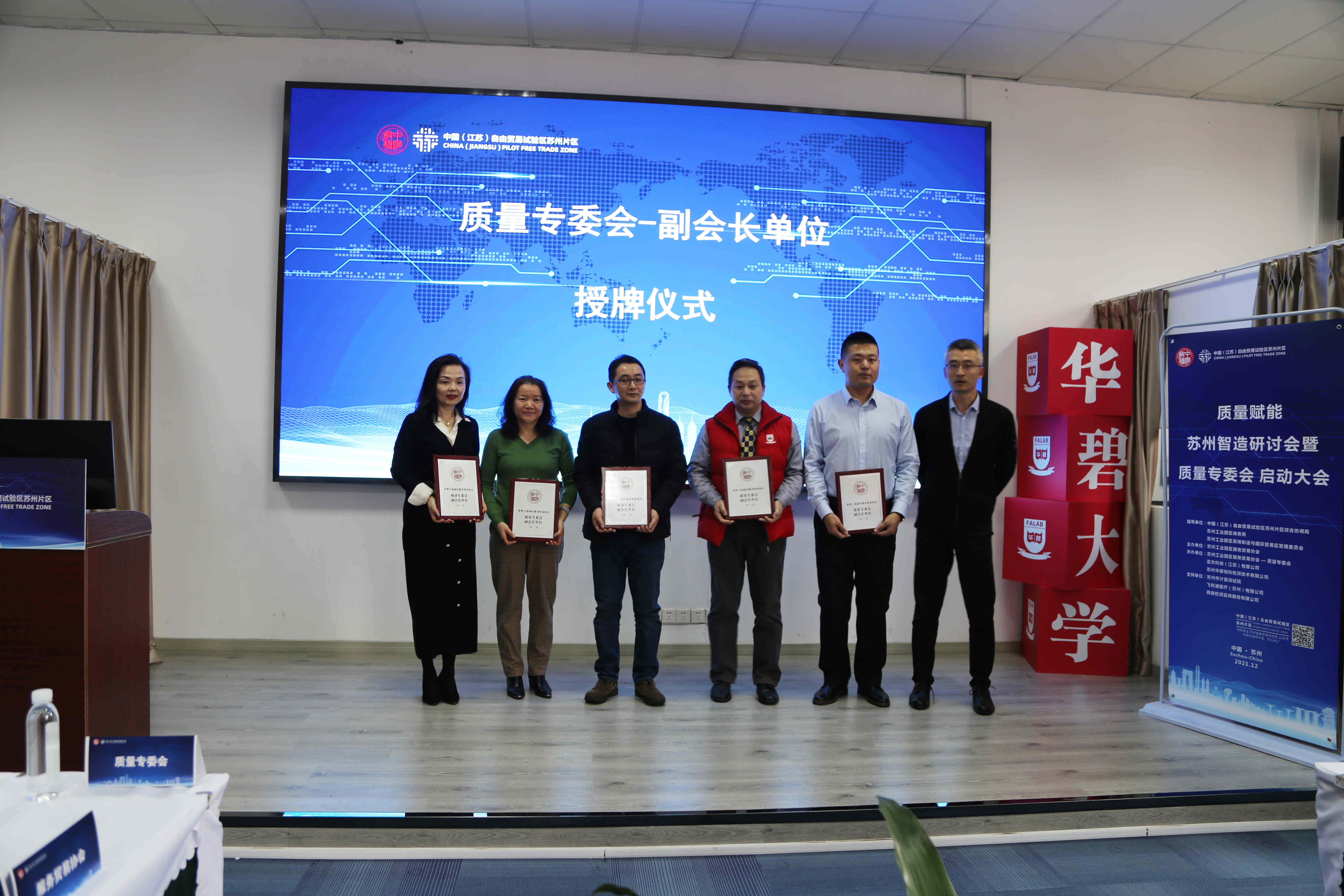 會議伊始,蘇州自貿區綜合協調局副局長趙建剛發表大會致辭,質量專委會副會長、蘇州華碧微科檢測技術有限公司總裁劉學森作歡迎致辭。隨后,質量專委會啟動儀式分別對蘇州華碧微科檢測技術有限公司、飛利浦醫療(蘇州)有限公司、科大訊飛(蘇州)科技有限公司等共16家會員單位進行授牌,并宣布質量委員會正式成立。