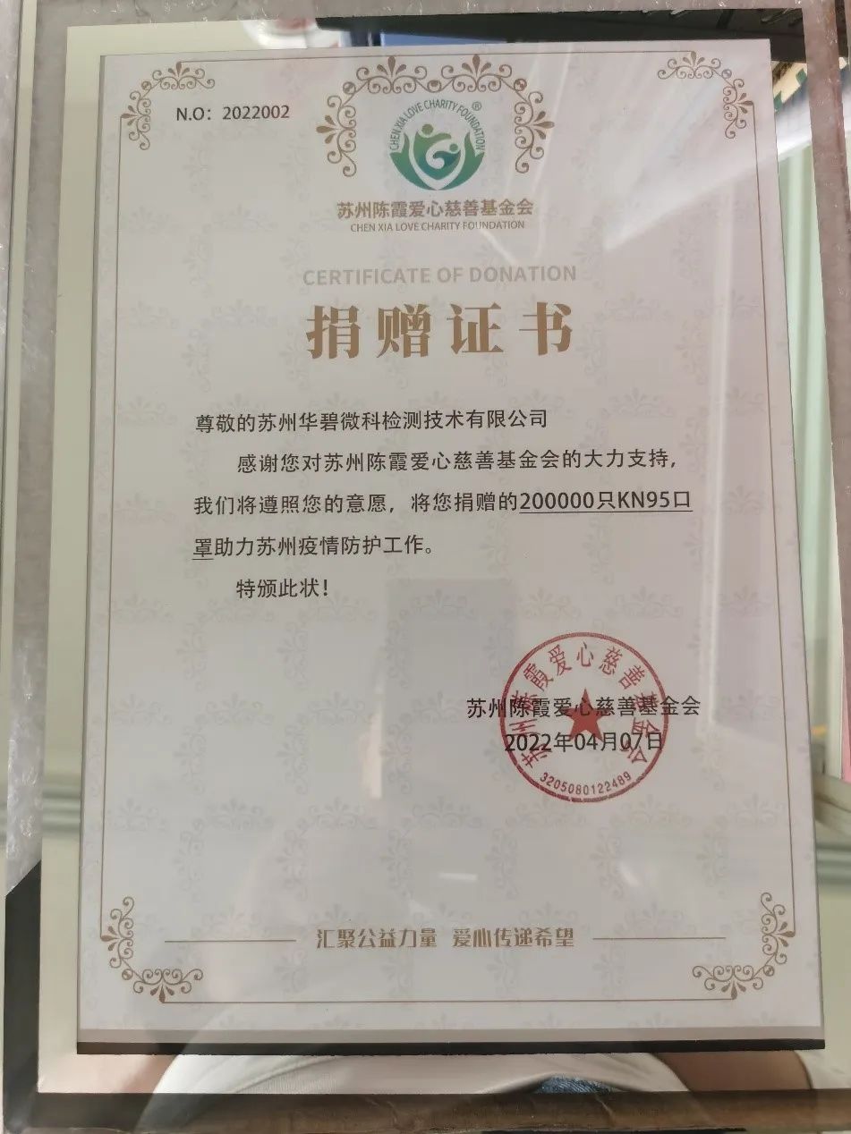 2022年4月12日,蘇州華碧微科檢測(cè)技術(shù)有限公司向蘇州陳霞愛(ài)心慈善基金會(huì)捐贈(zèng)20萬(wàn)只KN95口罩用于抗擊疫情。本次捐贈(zèng)是華碧實(shí)驗(yàn)室所自2019年新型冠狀病毒感染的肺炎疫情出現(xiàn)以來(lái)的第十一次慈善公益捐贈(zèng)。
