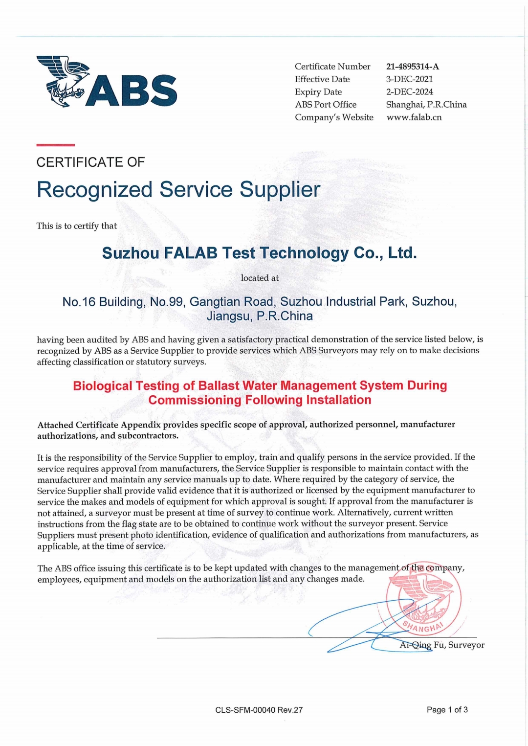 FALAB has successfully passed the accreditation of ABS ballast Water Management Commissioning Test (BWMS) since ABS released the Ballast Water Treatment Guide 2021 last year. FALAB has passed the test of international standards and enhanced its business capabilities. FALAB can provide professional ballast water testing services for ABS customers  all over the world.