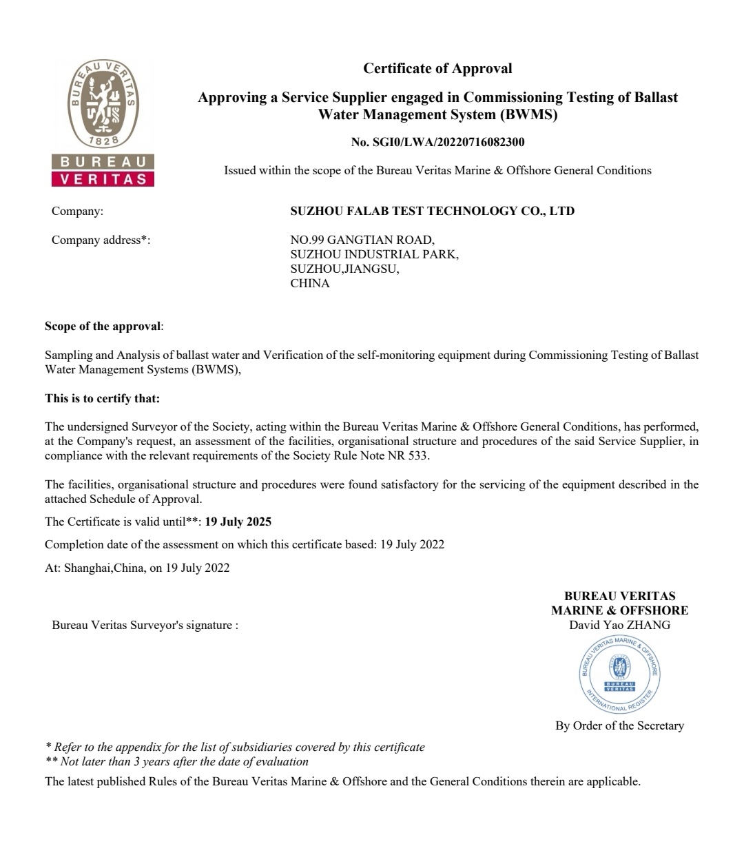 7月中旬,華碧(FALAB)通過了法國船級社(BV)的認證,成功取得其壓載水管理系統(tǒng)調(diào)試試驗(BWMS)資質(zhì)認可,提升了華碧(FALAB)在壓載水檢測領(lǐng)域的服務(wù)能力。