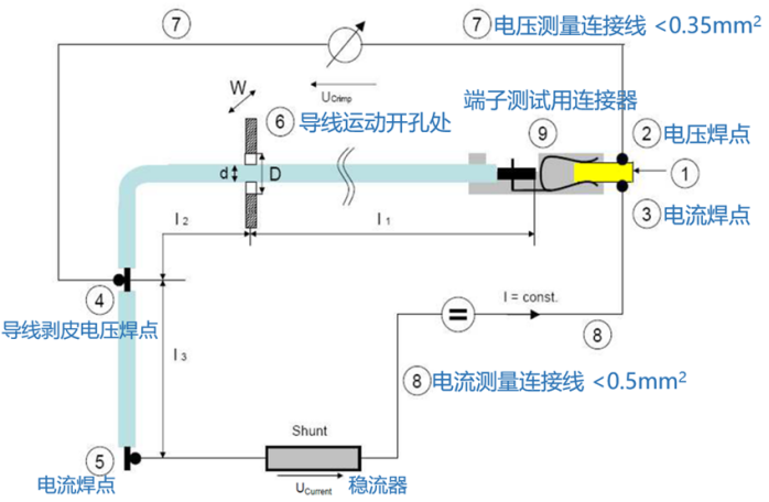如果不使用齒狀PCB板(如端子是圓形的),電壓測量線必須用膠水(導電膠)粘合在端子本體上,不能焊接(不允許在端子端有焊接)。對于粘膠連接,章節3.2.4部分的測量必須在順序測試開始和結束均執行。