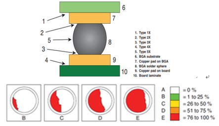 對于存在染色的器件,試驗結果一般選用如下圖1所示的“染色點位分布”來呈現。其中,方格表示器件所有焊點的分布;黑色方格表示此處不存在焊點;白色方格表示此處焊點無異常不存在染色;綠、黃、橙、紅方格表示此處焊點存在染色(不同顏色代表不同染色面積占比,如下圖2);方格內數字(1、2、3、4、5)表示此處染色焊點的斷裂模式(如下圖2)
