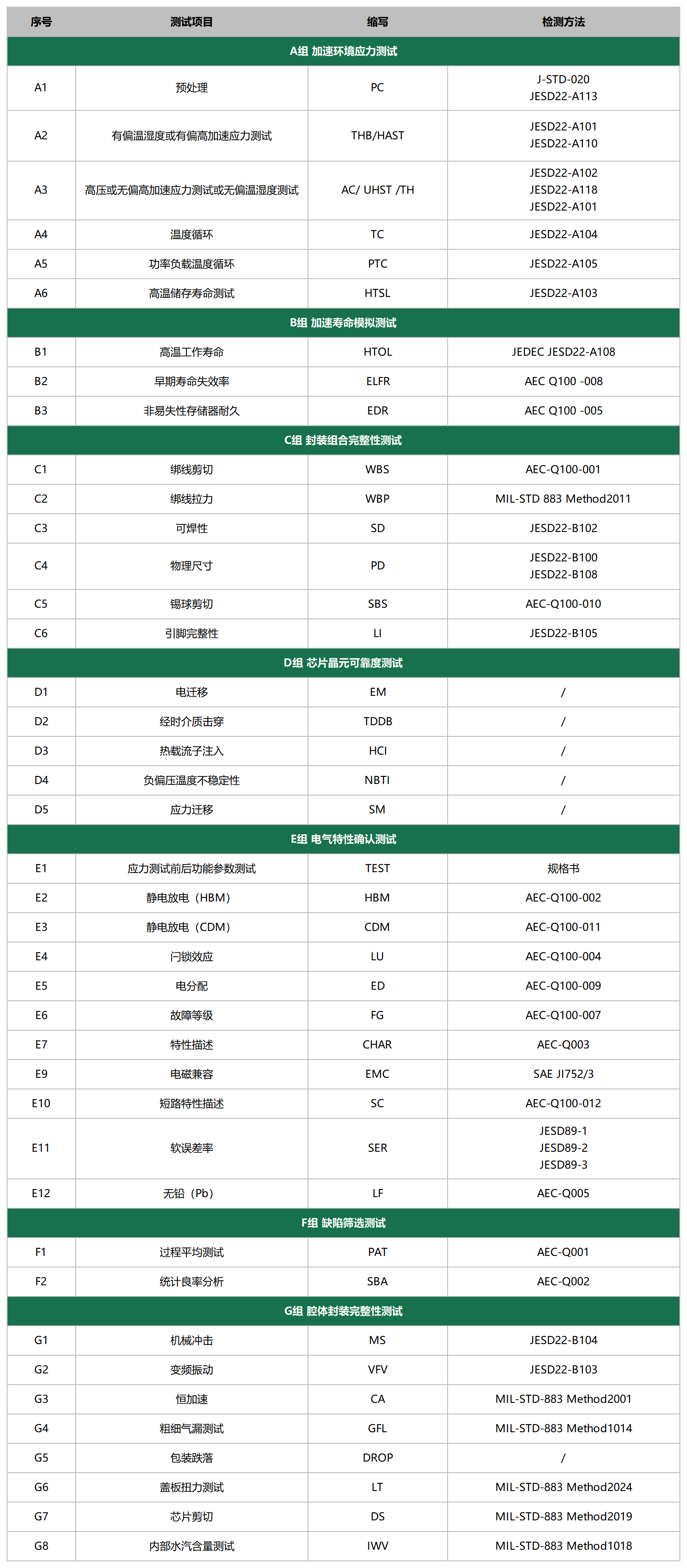 AEC Q100是基于失效機理的集成電路應力測試鑒定,由AEC委員會制定,適用于車用 IC 芯片的綜合可靠性測試認證標準,是芯片產品應用于汽車領域的基本門檻。首版于1995年發行,并持續更新到2014年的 H 版本,也是目前沿用的標準。AEC Q100標準是芯片產品(依產品類型、封裝形貌及取樣數量的要求)執行并通過的必要測試項目。